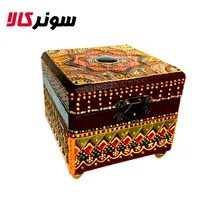 جنس جعبه از چوب هست که بعد از زیر کار خوردن و مقاوم سازی طرح اورجینال روش کشیده می شه و هنرمند جزء به جزء با خط و نقطه بهش شکل میده