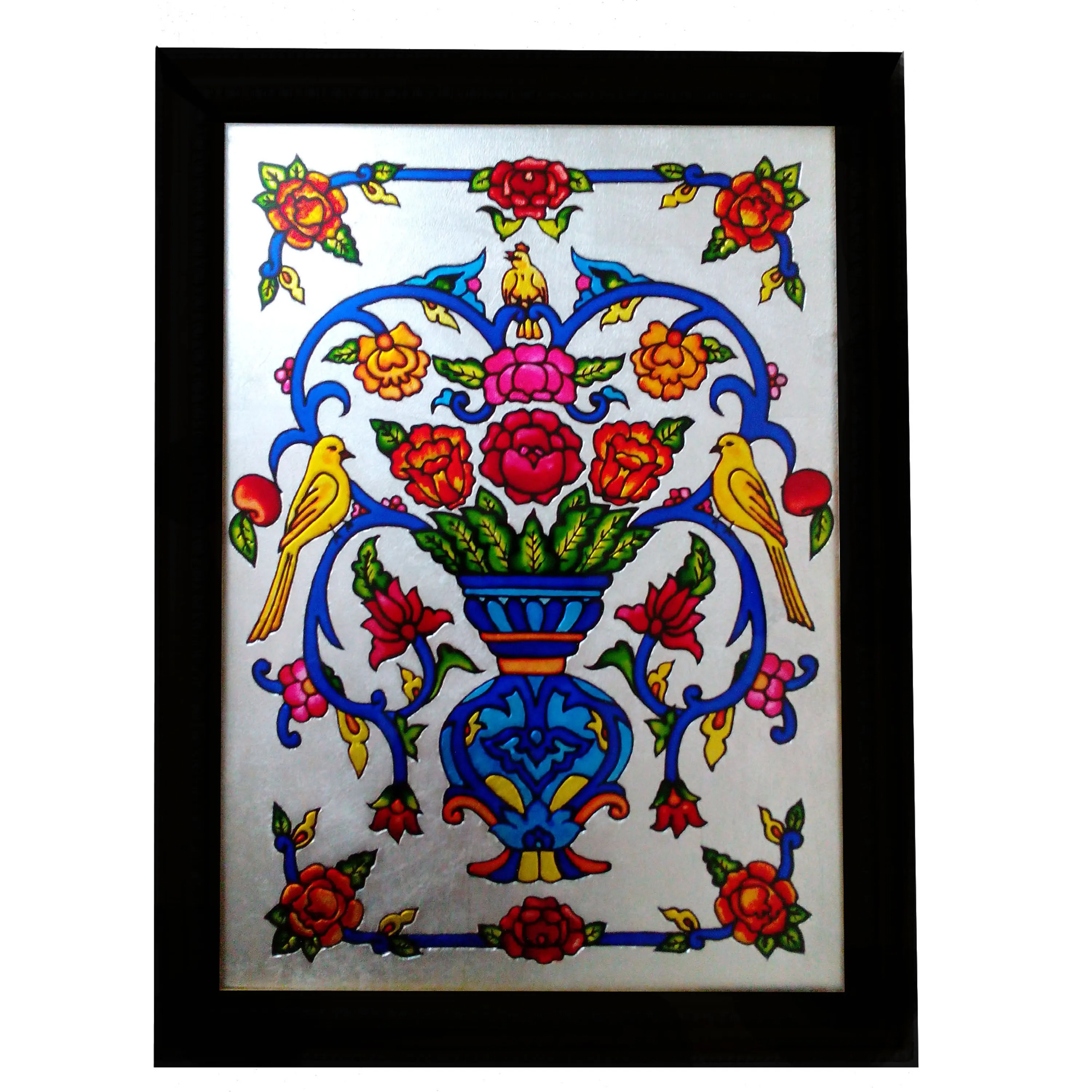 این تابلو هنری زیبا تکنیک نقاشی پشت شیشه است و تمام سطح با ورق نقره پوشیده شده
